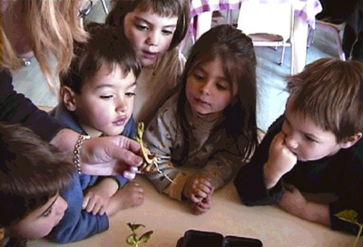 Beispiel: Viele Kinder sind der Auffassung, dass man eine größere Pflanze erhält, wenn man mehrere Samenkörner in dasselbe "Loch" pflanzt. Erst die gezielte Beobachtung der Anzucht lässt die Kinder feststellen, dass ein keimendes Samenkorn eine Pflanze hervorbringt. Andere Kinder rätseln, warum ihre Kartoffelpflanzen sich "zum Fenster hin neigen". Indem man die jungen Pflanzen ein wenig dreht oder verschiebt, kann man sehen, wie das Licht die Ausrichtung der Pflanzen während des Wachstums beeinflusst.