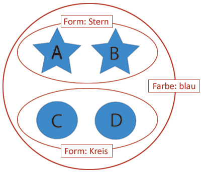Es werden Mengen gebildet, "Schachteln". Jede Menge erhält ein Etikett aus der Liste der gemeinsamen Merkmale. Als lege man beschriftete Schachteln in Schubladen und schiebe die Schubladen in ein Möbelstück. Die Mengen dürfen verschachtelt sein.