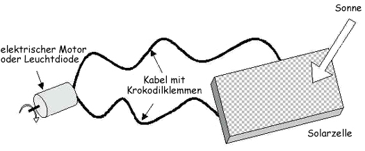 An jede Gruppe werden eine Solarzelle, ein Motor und Kabel verteilt. Es wird folgende Aufgabe gestellt: Wie kann man einen Motor unter Nutzung von Sonnenenergie zum Laufen bringen? Anschließend kann man die Schüler auffordern, mit Sonnenenergie eine Leuchtdiode zum Leuchten zu bringen. Mit einer einzigen Solarzelle funktioniert das nicht. Wenn sich die Schüler gut an das Modul über Elektrizität erinnern, kommen sie vielleicht auf die Idee, mehrere Zellen in Reihe zu schalten.