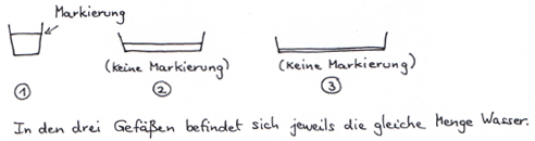 In drei Gefäße unterschiedlicher Größe wird jeweils die gleiche Menge Wasser gegossen. Es wird der Wasserstand am Gefäß markiert.