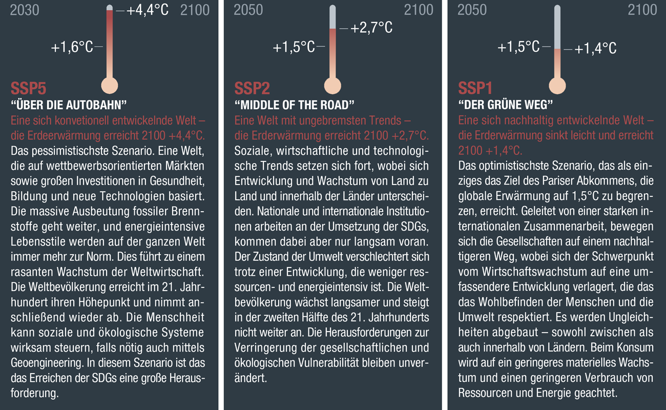 Abb. 6: Die gemeinsamen sozioökonomischen Pfade SSP5, SSP2 und SSP1. Zum Vergrößern auf das Bild klicken.