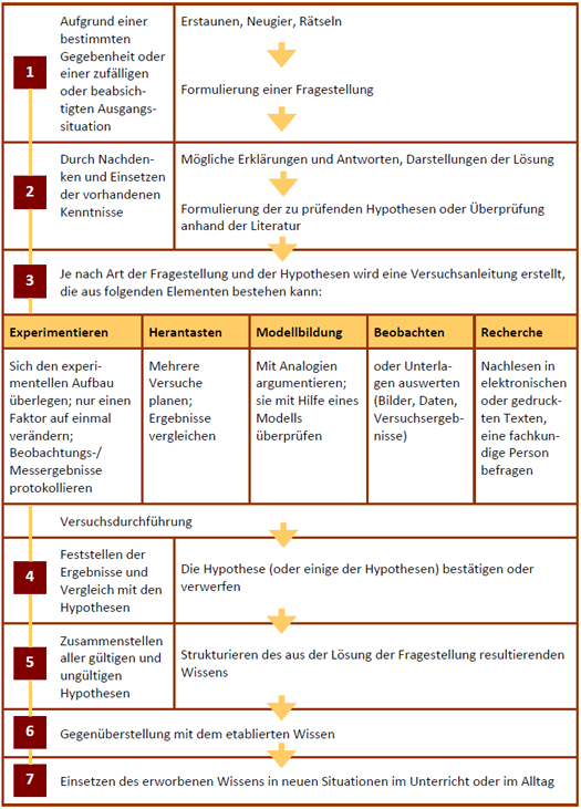 Methodenvielfalt: Die Methoden, mit denen die Schüler bei ihren Untersuchungen vorgehen, können unterschiedlich sein, und das auch in ein und derselben Unterrichtsstunde: experimentieren, etwas anfertigen (einen Gegenstand oder ein Modell bauen, nach einer technischen Lösung suchen), beobachten – unmittelbar oder mit Hilfe eines Instrumentes (das nicht der Computer ist) –, in der Literatur oder/und im Internet recherchieren, eine Umfrage planen und durchführen, eine Radiosendung oder einen kleinen Film machen, einen Ausflug organisieren. Die Schüler beobachten nicht nur, sie identifizieren, klassifizieren, sortieren, ordnen, formulieren Fragestellungen, machen Vorhersagen – und erklären, weshalb sie genau das vorhersagen –, sie stellen etwas nach (simulieren), experimentieren – wenn sich das bei der Fragestellung anbietet –, zeichnen und schreiben ihre Beobachtungen auf und fassen sie anschließend zusammen.