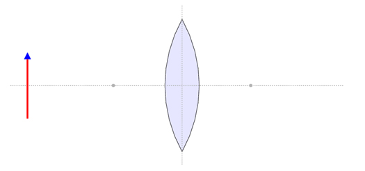 Mit diesen recht einfachen Regeln kann man verstehen, wie das Bild eines Gegenstands entsteht. Die Ausgangssituation ist die Folgende: In der Mitte steht eine Linse und links davon ein Objekt, in diesem Fall ein roter Pfeil mit einer blauen Spitze. Auf der optischen Achse der Linse sind die beiden Brennpunkte links und rechts der Linse durch graue Punkte markiert.
